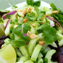 - Whisk together the sugar and vinegar in a mixing bowl until the sugar has dissolved. Add the cucumbers, jalapeno peppers, and cilantro; toss to combine. Sprinkle chopped peanuts on top before serving.